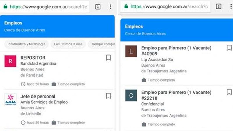 A partir de hoy se puede buscar trabajo con Google. La empresa lanzó en la Argentina su nueva función Empleos, un nuevo tipo de resultado de búsqueda que muestra ofertas laborales.