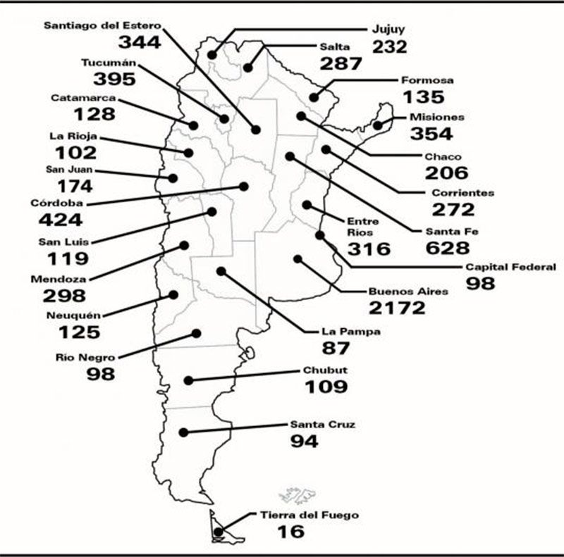 La provincia con mayor cantidad de muertes en accidentes de tránsito fue Buenos Aires con un total de 2.172 decesos y completan el ranking Santa Fe (628), Córdoba (424), Tucumán (395), Misiones (354), Santiago del Estero (344), Entre Ríos (316), Mendoza (298), Salta (287) y Corrientes (272).