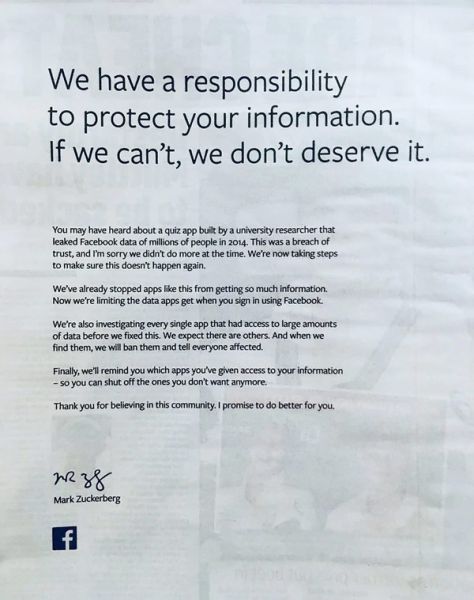 "Tenemos una responsabilidad: proteger sus datos. Si no lo logramos, no los merecemos", tituló Mark Zuckerberg.