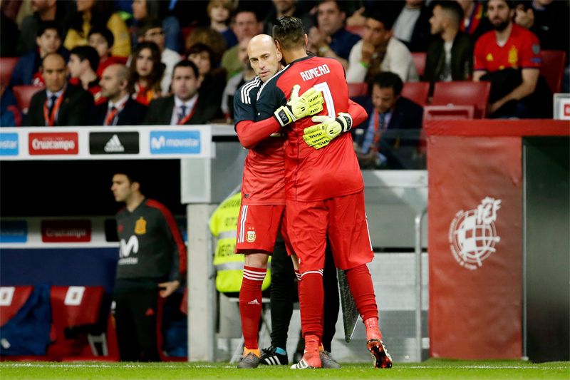 El arquero del seleccionado argentino de fútbol, Sergio Romero, sufrió hoy un traumatismo en la rodilla derecha sin consecuencias de gravedad, pero que motivó su reemplazo por Wilfredo Caballero a los 22 minutos del primer tiempo de la goleada histórica sufrida ante España por 6 a 1 en Madrid.