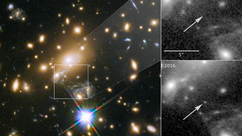 Los astrónomos observaban con el Telescopio Espacial Hubble un cúmulo de galaxias a 5.000 millones de años luz de distancia y notaron una luz parpadeante al fondo de la imagen, destacó la agencia EFE.