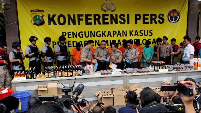 La Policía presentó en la rueda de prensa a seis sospechosos cubiertos con pasamontañas de las siete personas detenidas en Yakarta por la venta de alcohol adulterado que, según los análisis de laboratorio, contenía metanol.