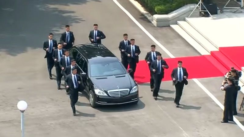 Los hombres vestidos con elegantes trajes y con corbatas azules todas iguales, marcharon muy cerca del líder norcoreano, a medida que éste se acercaba a la línea que demarca la frontera donde lo esperaba su homólogo surcoreano, Moon Jae-in.