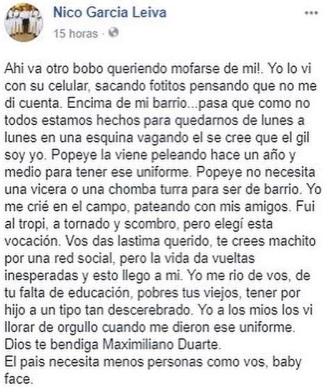 “Yo me río de vos, de tu falta de educación, pobres tus viejos, tener por hijo a un tipo tan decerebrado. Yo a los míos los vi llorar de orgullo cuando me dieron ese uniforme. Dios te bendiga. El país necesita menos como vos, baby face", concluye el escrito.