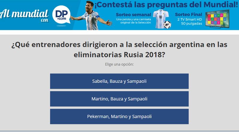 ¿Qué entrenadores dirigieron a la selección Argentina en las eliminatorias Rusia 2018? es la nueva consigna. Y las opciones son tres: Sabella, Bauza y Sampaoli / Martino, Bauza y Sampaoli / Pekerman, Martino y Sampaoli.