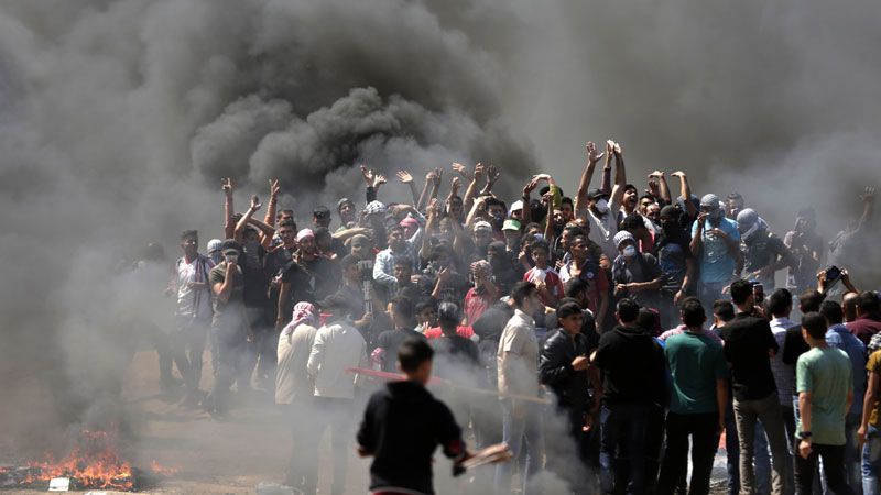 En el 70° aniversario de la creación del Estado de Israel y en una muestra de indignación por la reubicación de la embajada, decenas de miles de gazatíes se acercaron a la valla fronteriza con Israel, y cientos prendieron neumáticos y lanzaron piedras y bombas molotov en más de una docena de puntos a lo largo del límite.