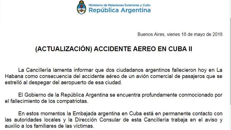 "En estos momentos la Embajada de la República Argentina en Cuba está en permanente contacto con las autoridades locales y la Dirección Consular de esta Cancillería trabaja en el aviso y auxilio a los familiares de las víctimas", concluyó la misiva oficial.