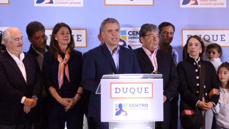 Duque celebró haber conseguido "la votación más alta en una primera vuelta en Colombia" y expresó su gratitud al CD y, en especial, al ex presidente Álvaro Uribe Vélez, líder del movimiento. También recordó al ex jefe de Estado Andrés Pastrana.