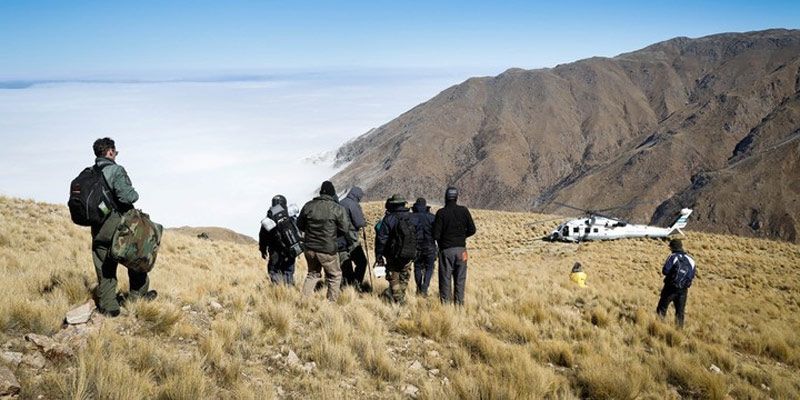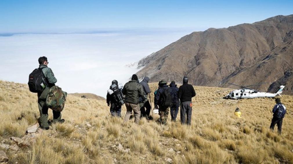 La comitiva presidencial en momentos del rescate, luego de haber pasado la noche en una zona de alta montaña de Catamarca, a raíz del aterrizaje de emergencia, por causas de malas condiciones climáticas, que debió realizar ayer el helicóptero que la transportaba desde Salta a Santiago del Estero.