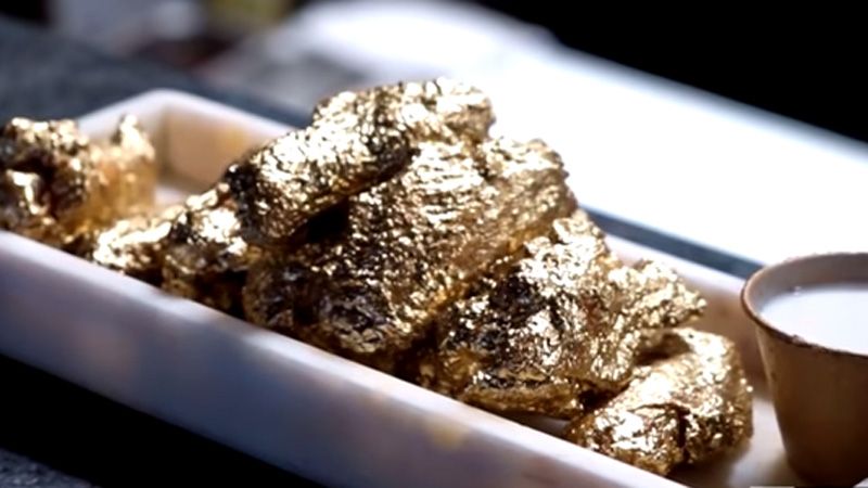 Se trata de estas alitas de pollo rebozadas con oro de 24 kilates. Este deslumbrante plato realizado con polvo de oro comestible no es apto para todos los bolsillos, ya que cuesta 40 euros la ración de diez piezas.
