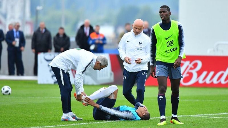 Una de las jóvenes promesas del equipo dirigido por Didier Deschamps fue atendido por el cuerpo médico en la zona del tobillo izquierdo, luego intentó retornar al ejercicio pero sin éxito ya que inmediatamente se sacó la pechera y se fue al vestuario.