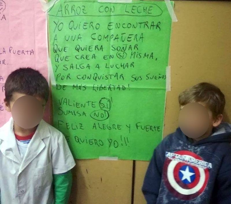 Una cartulina con la letra modificada apareció en un colegio primario y provocó muchas repercusiones. "Valiente sí, sumisa no", reza una frase.