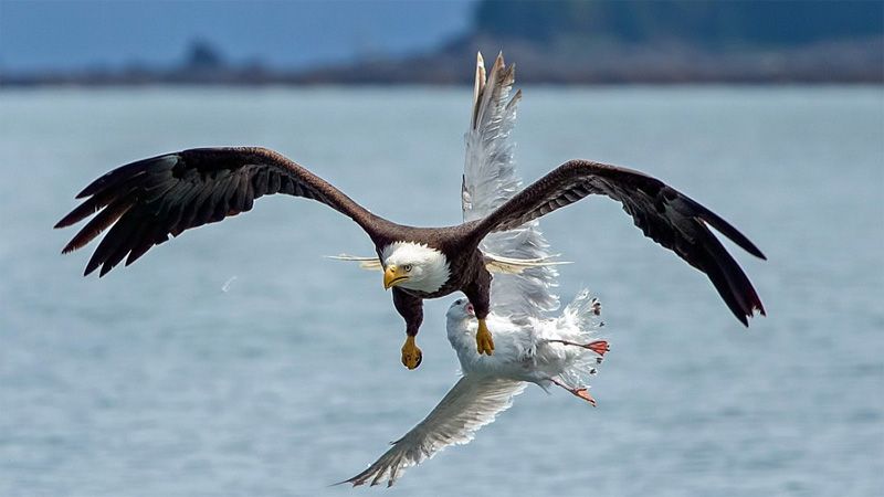 Un águila hambrienta tendió una emboscada a una gaviota desafortunada cuando menos lo esperaba mientras se dirigía al agua para pescar arenque.