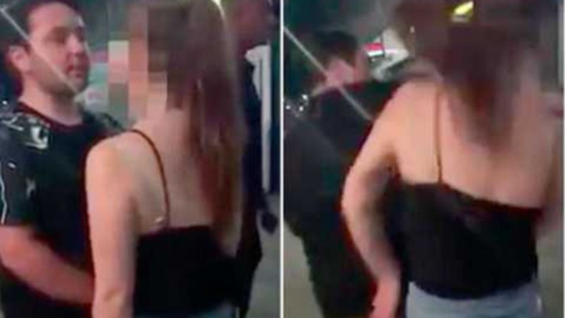 Una mujer se acercó a Liam Holmes y lo increpó. En el video no se llega a escuchar qué le dijo. La golpeó dos veces y la tiró al piso.