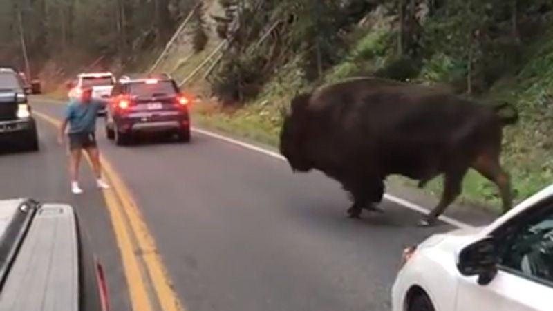 Lindsey Jones grabó desde la seguridad de un vehículo la escena alarmante que arrancó con el hombre golpeando su pecho para atraer la atención del bisonte.