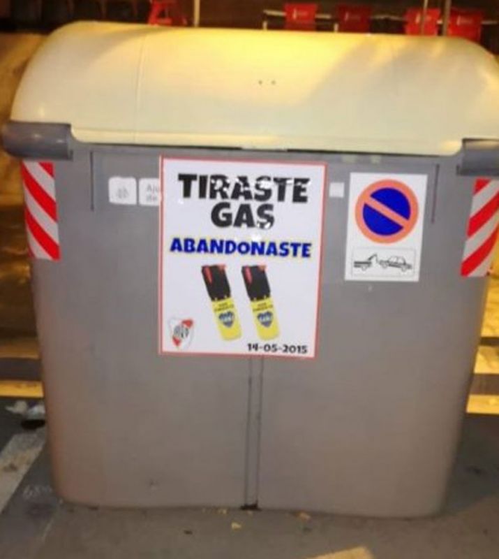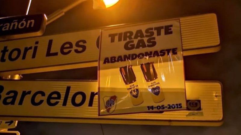 "Tiraste gas", "abandonaste" y "14-05-2015" fueron los mensajes que aparecieron en alusión a la agresión que sufrió el plantel de River en la Bombonera durante los octavos de final de la Copa Libertadores de ese año.