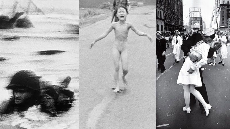 Besos inolvidables, muerte en primer plano y postales de guerra. Un repaso por algunas imágenes emblemáticas que inmortalizan momentos clave para la historia.