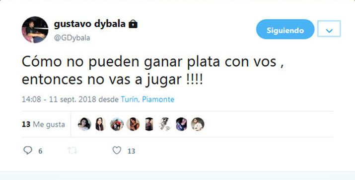 Pocas horas antes de que la Selección Argentina enfrente a Colombia en un amistoso, el hermano de Paulo Dybala, que no será de la partida en Nueva Jersey, publicó un misterioso tuit. "Como no pueden ganar plata con vos, entonces no vas a jugar", dice el texto, en la cuenta de Twitter de Gustavo Dybala, que es sólo accesible para aquellos a los que el autor autoriza.