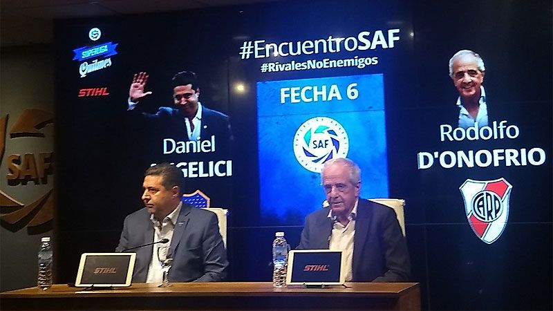 Daniel Angelici y Rodolfo D'Onofrio brindaron este lunes una conferencia de prensa en conjunto impulsada por la Superliga, para palpitar el Superclásico en un marco de no violencia. Y ambos coincidieron en poner el partido en el marco del deporte y no caer en la intolerancia.