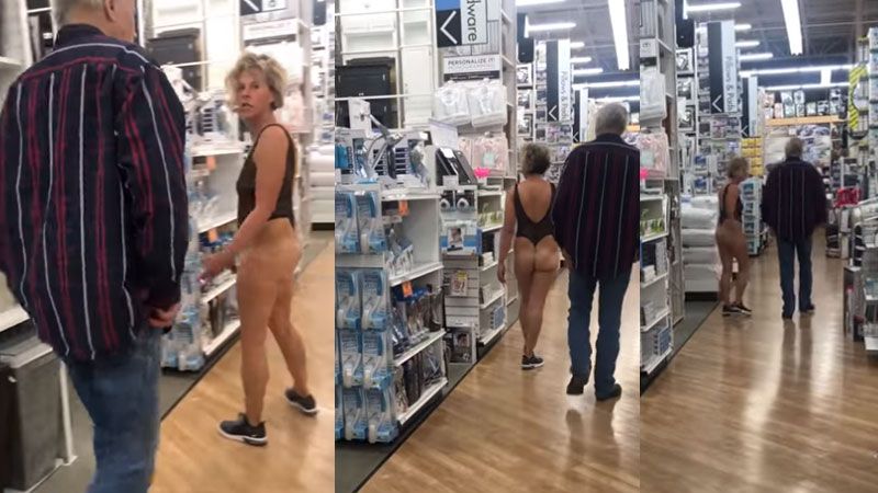 En las imágnes se puede ver a la mujer caminando entre los pasillos solo con una prenda de lencería y zapatillas, dejando práctimente toda su espalda expuesta y con cintas de embalar transparente pegados en la zona de su pubis y nalgas. A su lado camina un hombre vestido y con las manos en los bolsillos, como si todo fuese normal.