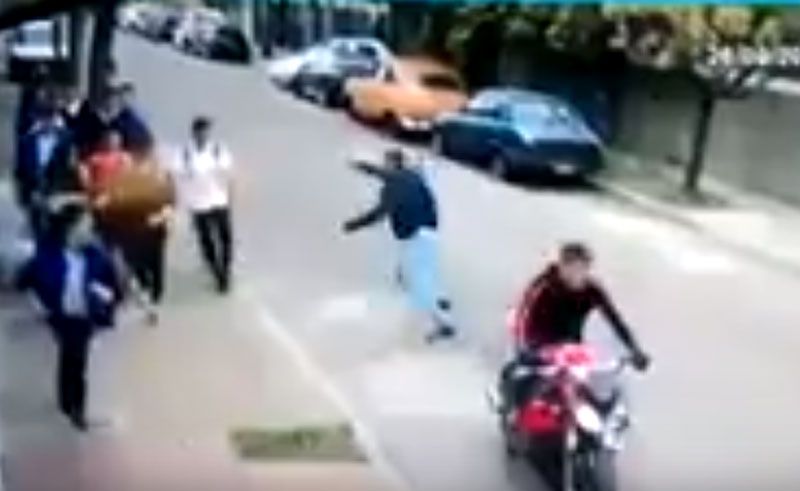Un grupo de estudiantes del Colegio Cervantes de la localidad de La Tablada, partido de La Matanza, fue asaltado por violentos motochorros a punta de pistola y la secuencia fue registrada por una cámara de seguridad.