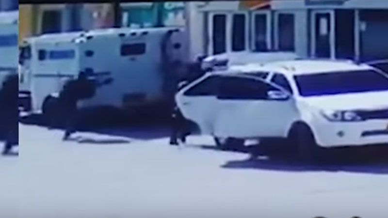 Una cámara de seguridad del sector registró el momento en el que guardias de seguridad de la entidad bancaria y agentes de la Policía inician un tiroteo contra los criminales para evitar el hurto. Un hombre de camisa amarilla se baja de la camioneta blanca para ayudar a sus compañeros, mientras el conductor realiza una maniobra para salir a toda velocidad, ya con todos los asaltantes a dentro.