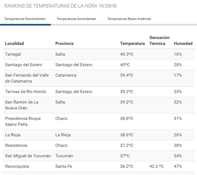 La temperatura siguió en ascenso y, a las 16, alcanzó los 40°C, según el Servicio Meteorológico Nacional; mientras que la sensación térmica, a esa hora, marcó 44.9°C.