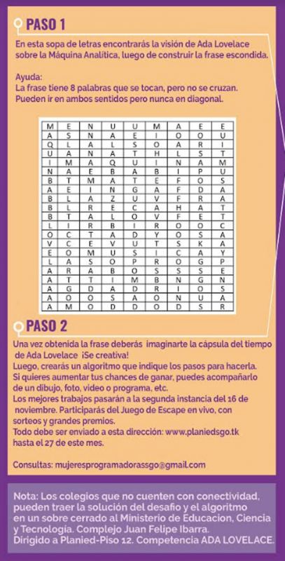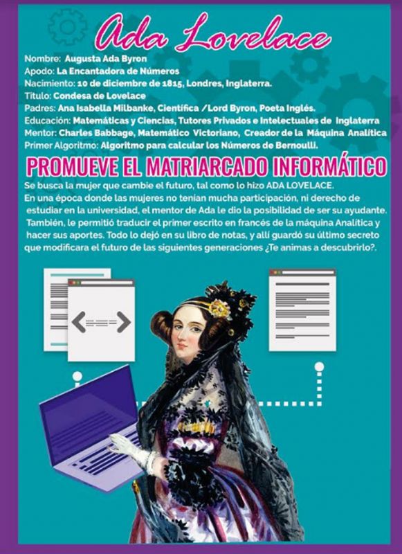 Para disminuir esta brecha tecnológica, convencidos en que los juegos en educación multiplican, favorecen y potencian el trabajo en equipo, han diseñado un Juego de Escape basado en la primera programadora Ada Lovelace, para estudiantes mujeres de colegios estatales de nivel Secundario de toda la provincia. Con la idea que ellas propongan soluciones de programación y tecnología a los desafíos planteados en cada instancia.