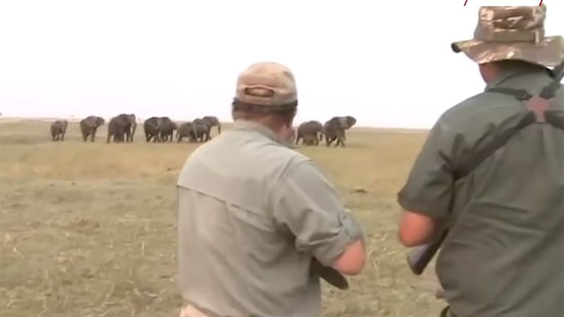 “Dispara entre los ojos”, se oye decir a uno de los protagonistas del vídeo. Después, se oye la detonación y uno de los machos recibe un disparo, después del cual se producen varios más, siempre contra el mismo objetivo. Finalmente, el elefante cae abatido, pero el resto de la manada entra en pánico y carga contra los dos cazadores.