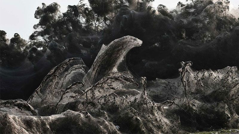 La gigantesca seda arácnida ha tapado la vegetación, desde arbustos hasta árboles, así como vallas y muros e incluso algunos santuarios de carretera típicos del país.
