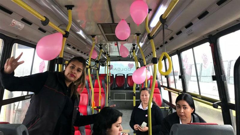 La conductora de uno de los coches de la línea 600 del transporte urbano decidió, con el apoyo de sus compañeras, colocar globos y entregar ayer viernes cintas de color rosa para concientizar a los pasajeros en el marco del Día Mundial Contra el Cáncer de Mama.