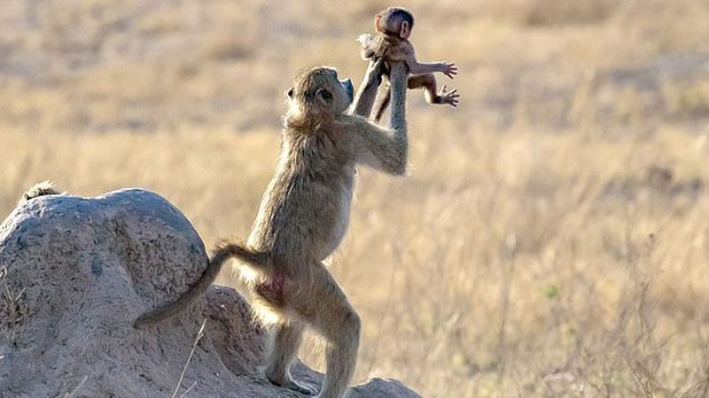 La famosa escena del Rey León "Círculo de la vida", donde Simba es levantado sobre las planicies africanas, ha sido representada en la vida real por un mono.