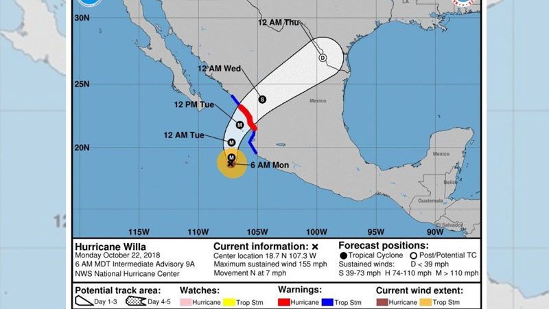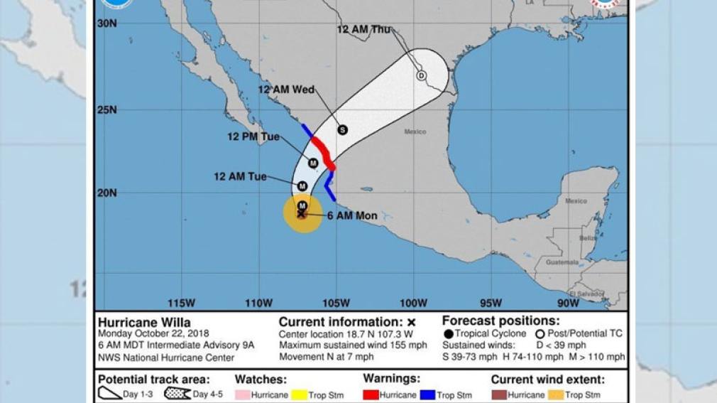 De acuerdo a la información revelada este lunes por el Centro Nacional de Huracanes de EE.UU. (NHC, por sus siglas en inglés), Willa se desplaza hacia la costa occidental de México con vientos que pueden alcanzar los 260 kilómetros por hora.