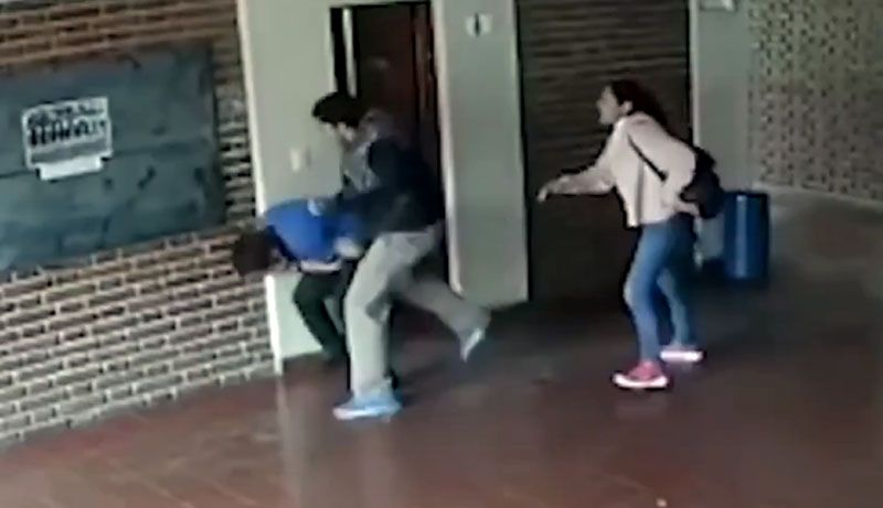 El escenario, la Escuela Comercial Femenina Santa María del Barrio San Martín de la ciudad de San Juan. Un hombre ingresó al establecimiento y se topó con un joven. Sin mediar palabras comenzó a pegarle. Lanzó 22 trompadas y una patada en el lapso de 15 segundos, hasta que la mujer que lo acompañaba y otras personas intervinieron para calmar la situación.