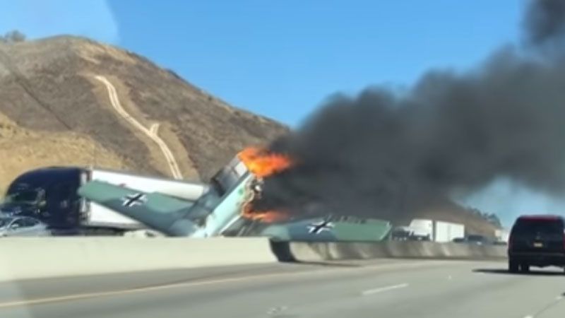 Un avión vintage de la Primera Guerra Mundial sufre un aparatoso accidente en una autopista de California.