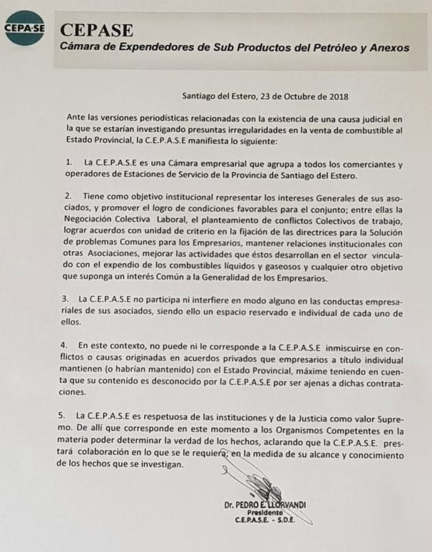 Con respecto estrictamente a la denuncia presentada ante la Oficina de Anticorrupción por sobreprecios que habrían cobrado numerosas estaciones de servicio, la Cepase aclaró que "no participa ni interfiere en modo alguno en las conductas empresariales de sus asociados, siendo ello un espacio reservado e individual de cada uno de ellos".