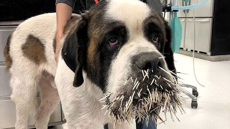 Un desafortunado San Bernardo se quedó con una boca llena de púas, después de un encuentro con un puercoespín, y no fue la primera vez.