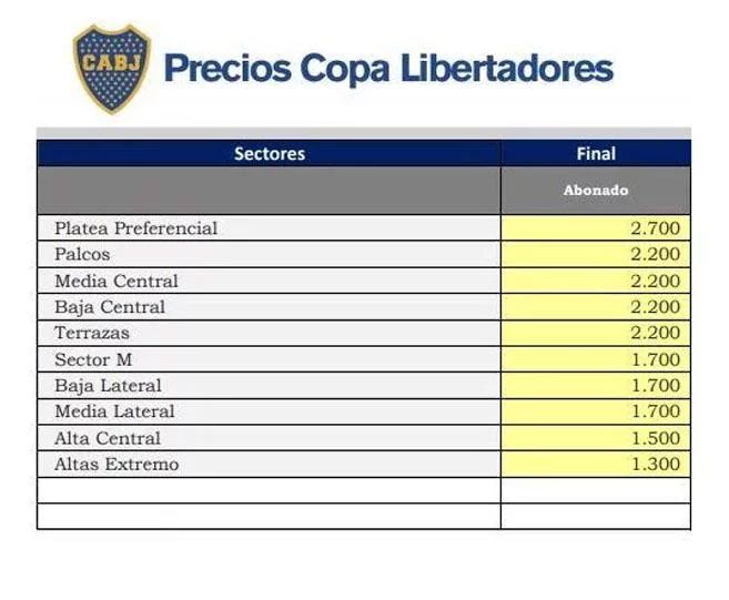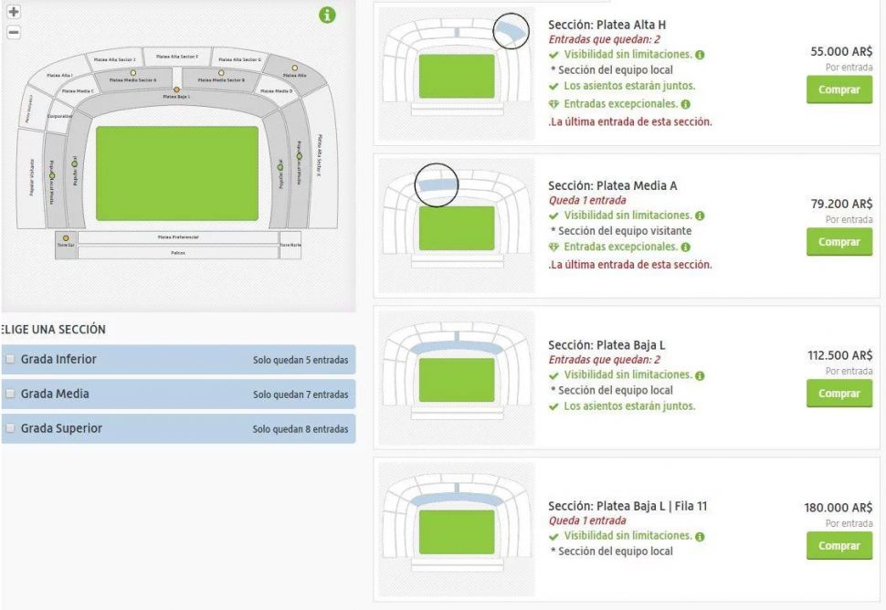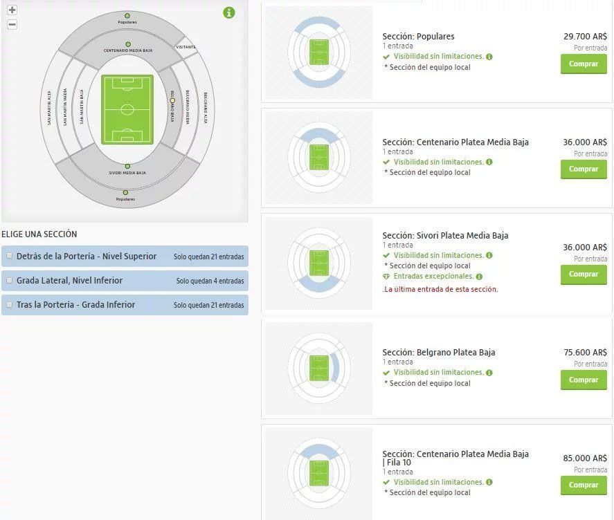 En el sitio Viagogo.com, plataforma secundaria de compra-venta de entradas para espectáculos en directo, se pueden encontrar plateas que van desde los 55 mil hasta los 180 mil pesos. También se ofrecen populares entre 40 y 50 mil pesos: lo curioso de estas es que la venta oficial será recién el jueves y a aquellos socios que saquen la adicional no le darán un ticket, sino que le habilitarán su propio carnet, que no es transferible.