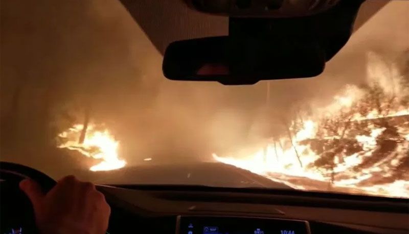 Como si estuvieran escapando del infierno mismo, una familia captó en video el aterrador momento en que manejan entre las llamas de un incendio forestal.