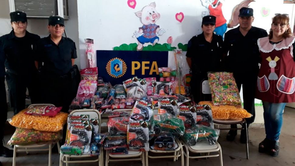 Miembros de la fuerza policial entregaron a directivos de la institución educativa las donaciones y compartieron momentos de juegos y distensión.