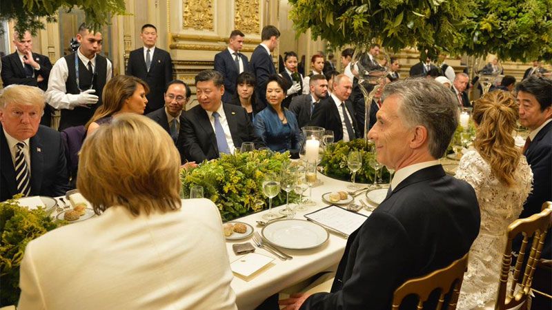 El presidente Mauricio Macri se ubicó en el centro de la mesa junto a su esposa, Juliana Awada, y enfrente está sentado su par estadounidense, Donald Trump, en tanto que al lado del mandatario argentino se ubica la canciller alemana, Angela Merkel, quien no pudo asistir al primer tramo de las deliberaciones y se dirigió directamente al Colón tras aterrizar en Argentina.