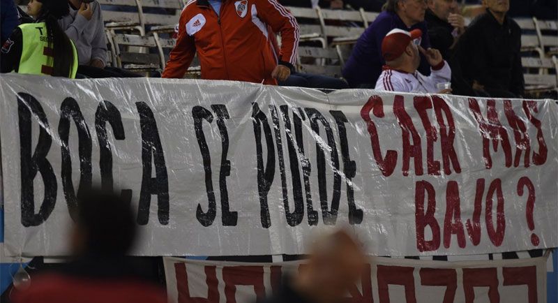 "Boca, ¿se puede caer más bajo?", decía la bandera que colgaron en la zona baja de una de las plateas del estadio Monumental. Claro, se debe a que el conjunto xeneize reclamó los puntos ante Conmebol, aunque el pedido fue desestimado y el encuentro se disputará el próximo domingo 9 de diciembre en Madrid.
