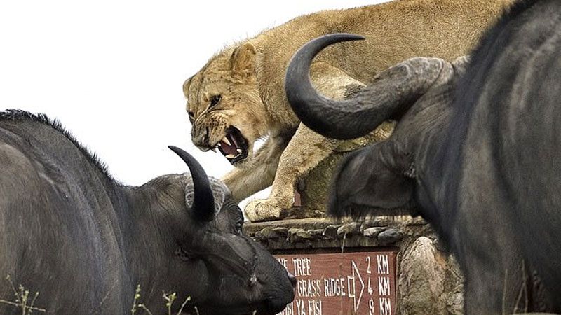 El joven y acorralado león muestra sus dientes ante el búfalo de agua que quiere matarlo, antes de que las hembras de su manada escuchen sus desesperados rugidos y acudan a rescatarlo.