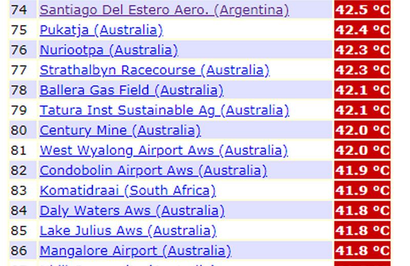Los 42,5º C que marcó el Servicio Meteorológico en su estación ubicada en el aeropuerto se colaron rápidamente entre las altas temperaturas de las ciudades australianas que son las que habitualmente lideran el ranking mundial generado por el sitio OGIMET en donde recopilan la información que brindan más de 4 mil estaciones meteorológicas de todo el mundo.