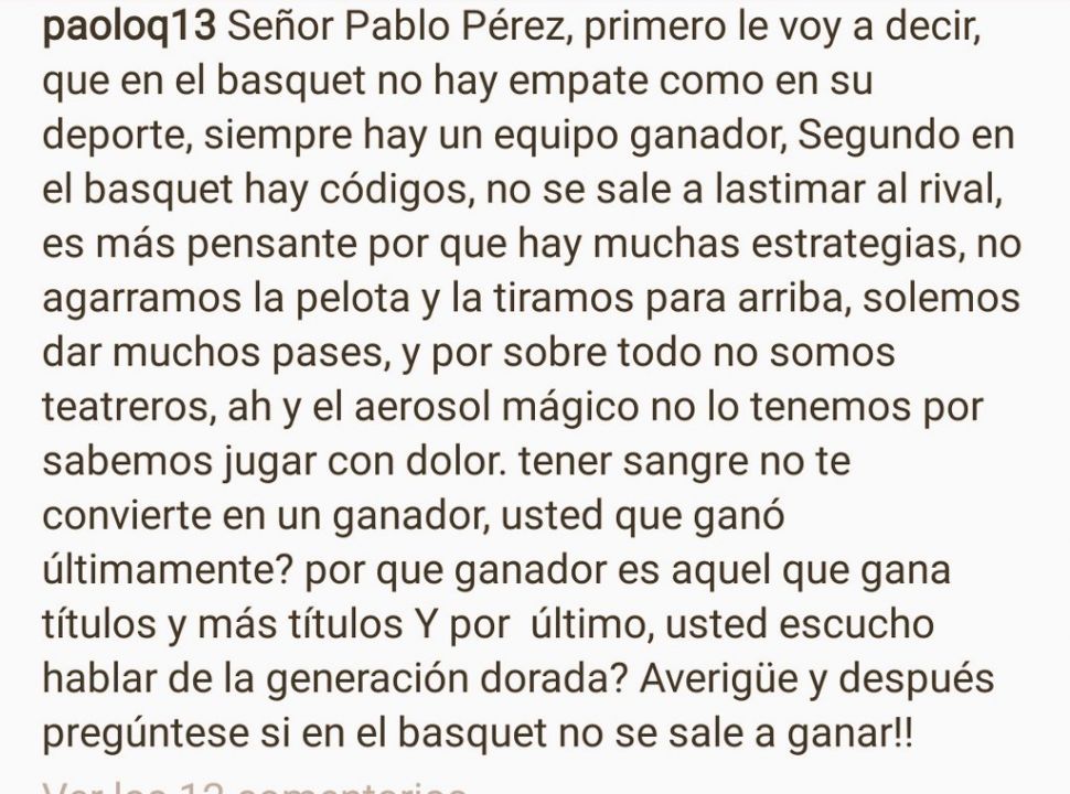 "Señor Pablo Pérez, primero le voy a decir que en el básquet no hay empate como en su deporte, siempre hay un equipo ganador. Segundo, en el básquet hay códigos, no se sale a lastimar al rival, es más pensante porque hay muchas estrategias, no agarramos la pelota y la tiramos para arriba, solemos dar muchos pases y, por sobre todo, no somos teatreros. Ah, y el aerosol mágico no lo tenemos porque sabemos jugar con dolor. Tener sangre no te convierte en un ganador, ¿usted que ganó últimamente? Porque ganador es aquel que gana títulos y más títulos. Y por último, ¿usted escuchó hablar de la Generación Dorada? Averigüe y después pregúntese si en el básquet no se sale a ganar!!", escribió Quinteros en su cuenta de Instagram.