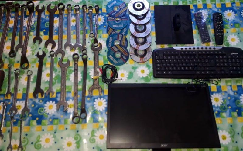 Efectivamente, se trataba de una parte del botín que se hallaba oculto, y en un primer momento, encontraron 1 monitor Acer y 2 teclados Netsys, negros, y algunas herramientas, 2 calibres; 5 cuchillos; 1 lima; 2 reglas de metal y 2 controles.