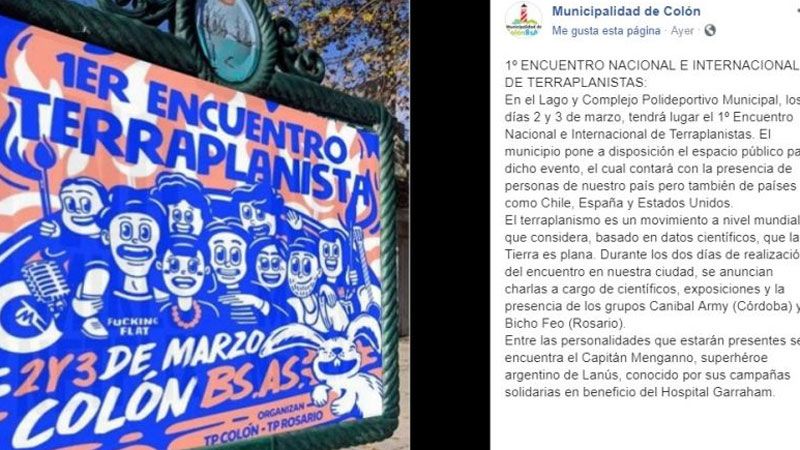 La municipalidad de Colón, una ciudad ubicada al Norte de Buenos Aires, se prepara para el primer encuentro nacional e internacional de terraplanistas. El evento, que se realizará el 2 y 3 de marzo, reunirá personas de Argentina, Chile, España y Estados Unidos.