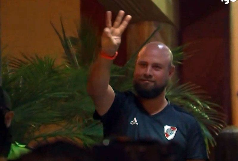 La persona, identificada con una camiseta del Millonario, hizo un "tres" con su mano desde el otro lado de la valla, recordando el resultado la final de la Copa en Madrid. A los pocos segundos, el personal de seguridad le pidió que se retirara del lugar.