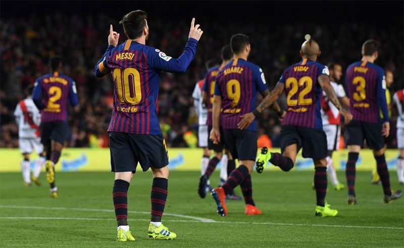 Lionel Messi marcó hoy un gol de penal en el triunfo 3-1 del líder Barcelona ante Rayo Vallecano, en el Camp Nou, por la vigésimo séptima fecha de La Liga española de fútbol.