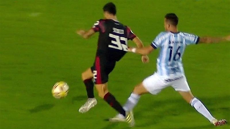 Cuando el delantero quería dominar la pelota, cayó por un ostensible agarrón del lateral Mathías Abero. Toda la camiseta de Nacho se estiró y quedó bien clara la sujeción. Increíblemente, el árbitro Diego Abal decidió no sancionar la falta. Scocco emprendió una protesta airada y la realidad indica que no era para menos. La falta podía significar para River abrir un partido en una cancha difícil, pero por el error grosero del juez no pudo ser.